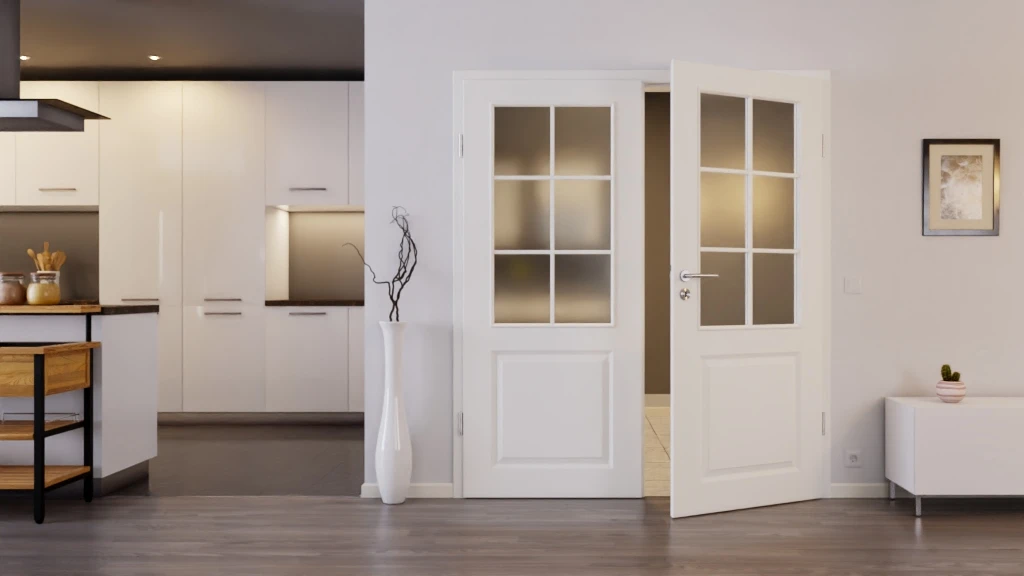 Der Mix aus Lichtausschnitten, Profilierungen und edler Weißlackierung in wahlweise RAL 9010 oder RAL 9016 sorgt für ein freundliches und helles Wohnraumdesign. Zwölf kleine Rechtecke entstehen dank der eingesetzten Sprossen auf den eleganten Glasflächen.