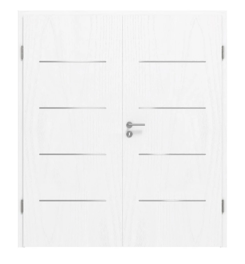 Schicke Lisenen im Edelstahl-Look: Die Doppelflügeltür Steel-Plain 14 in Esche Weiß von Hörmann sorgt für Eleganz in Ihrem Zuhause.