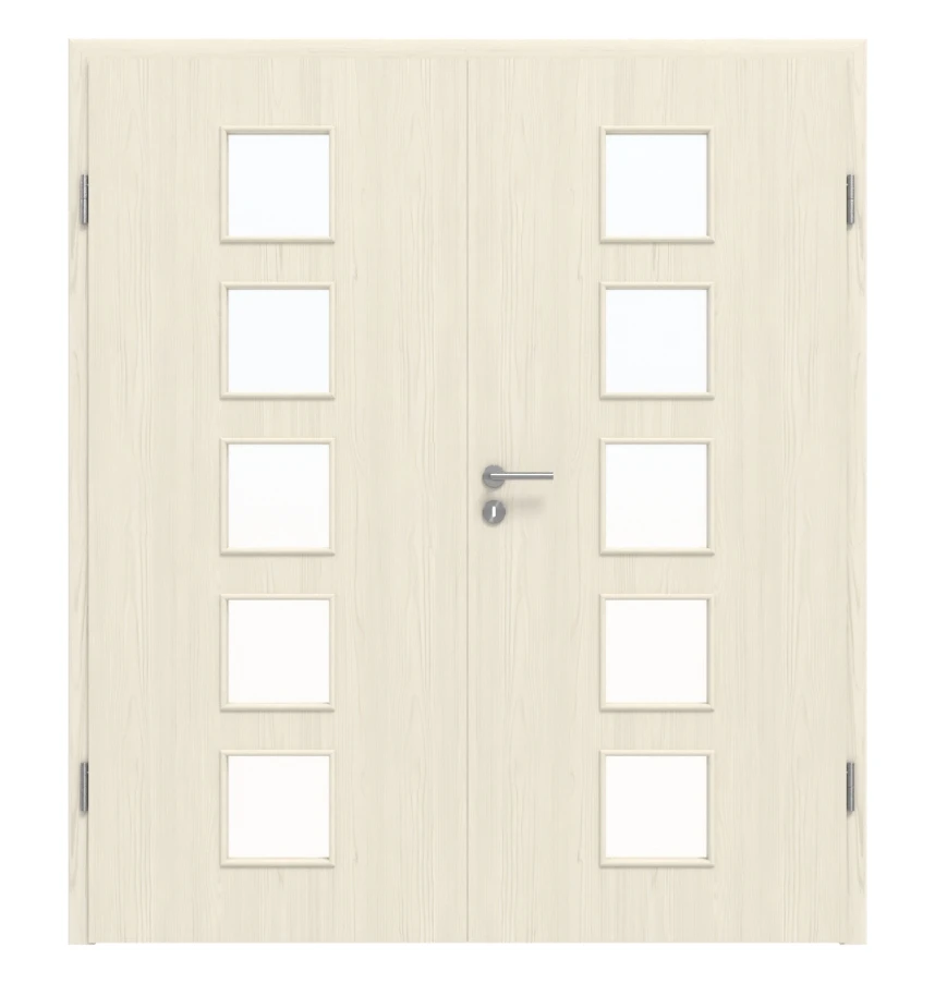 Die Doppelflügeltürblätter beinhalten insgesamt zehn quadratische Lichtausschnitte, die gemeinsam ein spannendes Design ergeben. Zusätzlich gelangt auf diese Art und Weise Helligkeit in Ihren Raum.