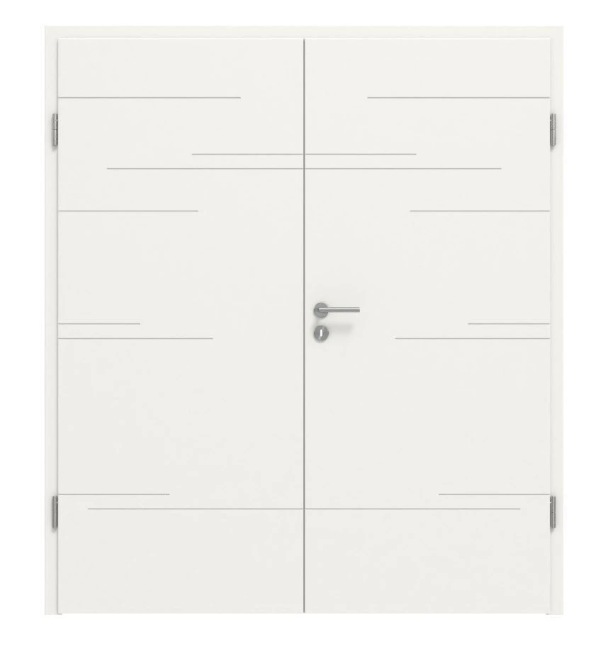 Neun waagerechte Fugen in unterschiedlicher Länge verlaufen über das jeweilige Türblatt. Die Weißlackierung garantiert eine schlichte und moderne Optik.