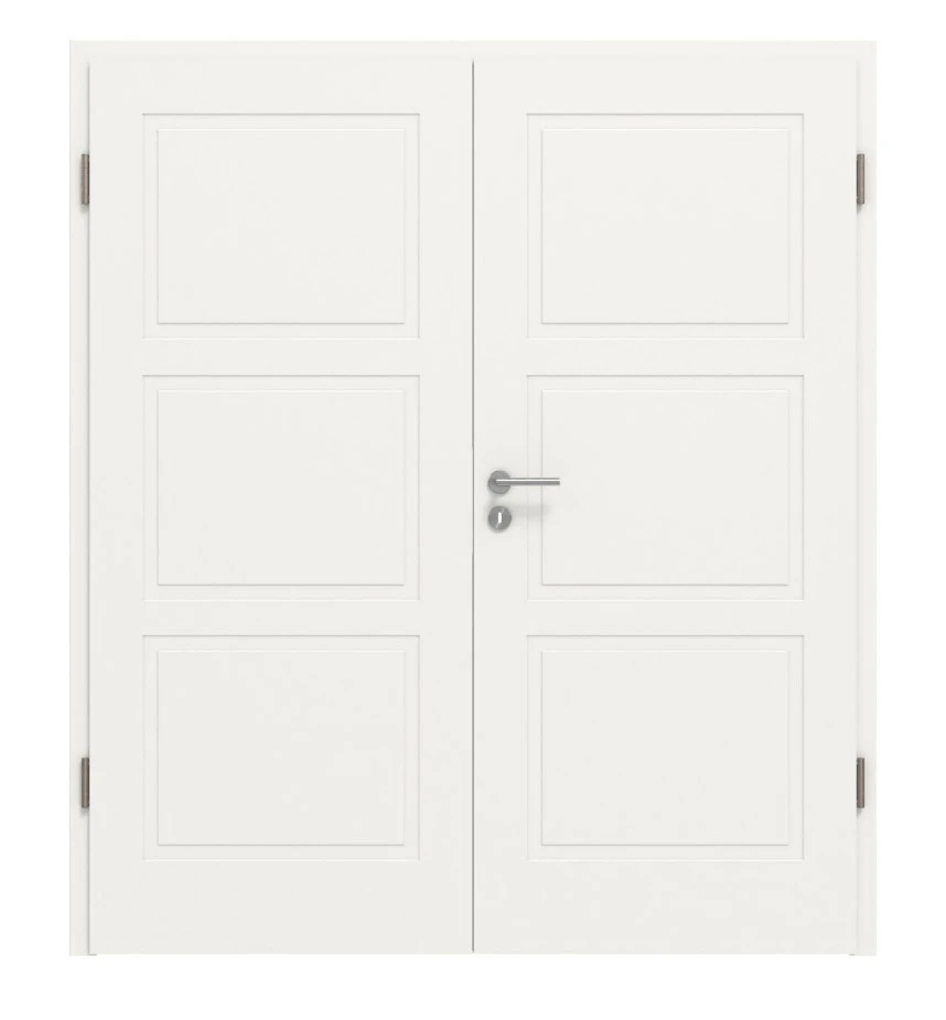 Auf den Türblättern zeichnen sich sechs gleichgroße Rechtecke ab. Die hochwertige Rahmung und die edle Weißlackierung in wahlweise RAL 9010 oder RAL 9016 sorgen für ein elegantes Design.