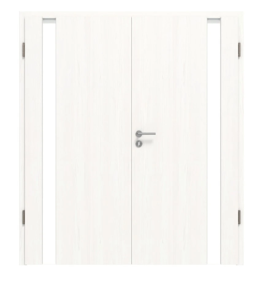 Auf dem weißen, zweiflügeligen Türblatt zeichnen sich graue Längslinien ab. Die länglichen Lichtbänder an den Bandseiten beider Türflügel sorgen für ein offenes Wohnraumdesign.