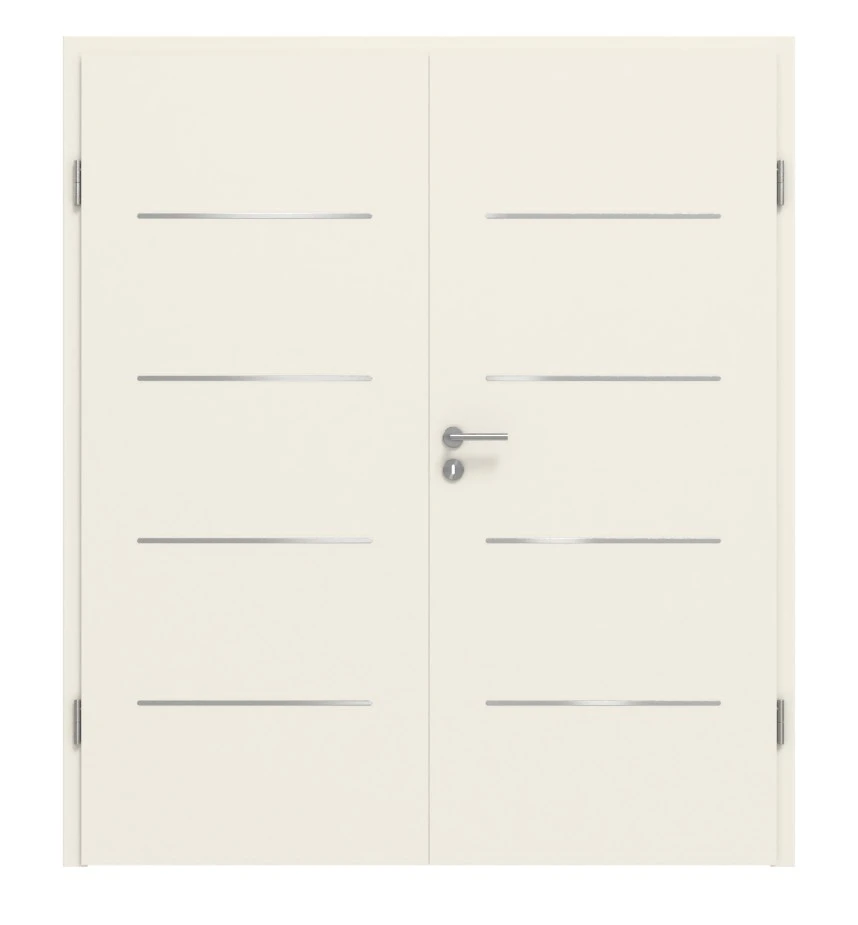 - Design-Besonderheiten: Türblätter mit aufgelegten Applikationen in Edelstahl‑Optik, Breite 10 mm
