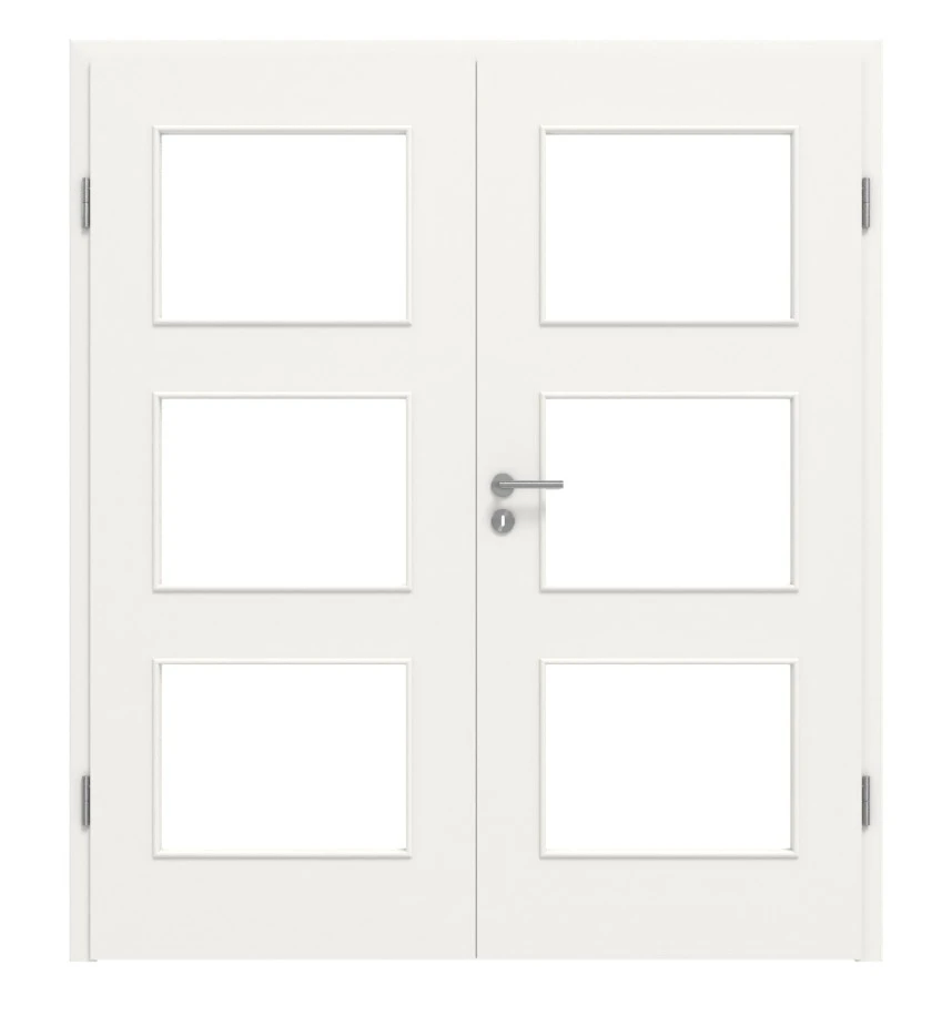 Drei rechteckige Lichtausschnitte erstrecken sich über nahezu das gesamte jeweilige Doppelflügeltürblatt. Dadurch gelangt viel Helligkeit hindurch, was wiederum zu einer harmonischen Gesamtstimmung beiträgt.