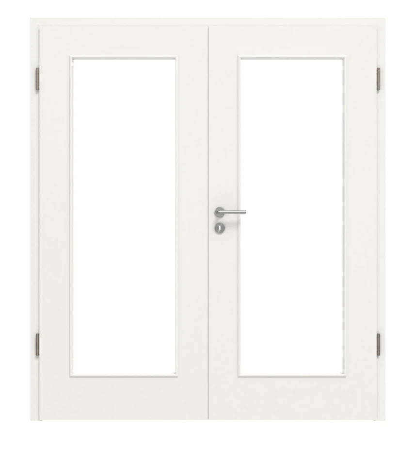 Alltagsbeständige ProLine-Doppelflügeltür in Weiß RAL 9016 mit stabiler Vollspanplatte und dreiteiligen Bändern: