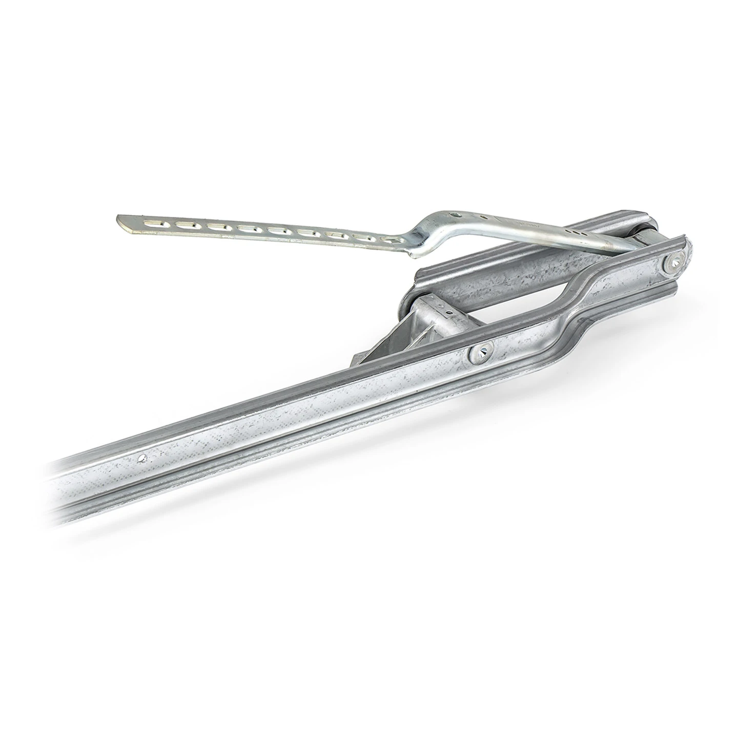 Die Hebelarm-Baugruppe besteht aus dem Hebelarm selbst, dem Lagerbock, worin dieser eingehängt ist sowie einer Halterung für die Federpakete. Dieses Federaufnahmeband ist immer am kurzen Ende des Arms angebracht. Weiterhin wird auch eine Adapterplatte mitgeliefert, die beim Einbau an älteren Toren (bis Serien-Nr. 98365) gebraucht wird. Die Länge des längeren Endes (X-Maß), welches am Torblatt eingreift, ist abhängig von der Torhöhe (X-Maß = BRH/2 – 102 mm). Somit ergibts sich für den Hörmann Ersatz-Hebelarm inkl. Adapterplatte, BRH 2000 mm ein X-Maß von 898 mm.