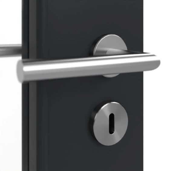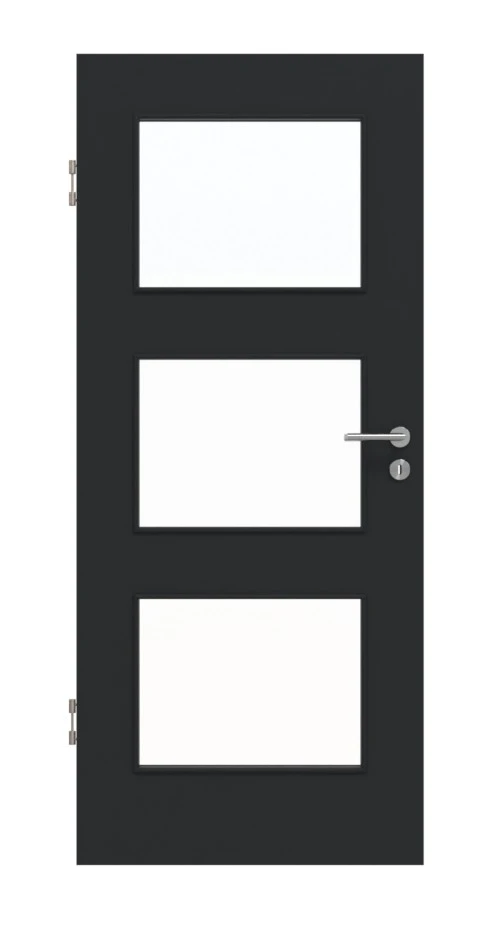 Für einen modernen Look sorgt das matte Lackfinish. In das anthrazitfarbene Türblatt sind drei große Lichtausschnitte eingelassen.