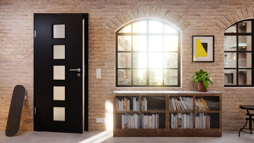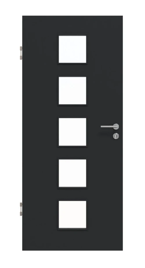 Aufgrund der matten Lackoberfläche in Anthrazit erhält die Oberfläche einen modernen Look. Durch die fünf quadratischen Glasausschnitte dringt viel Licht in Ihr Zuhause.