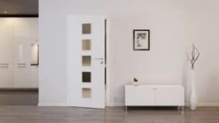 Vier quadratische Glasausschnitte sind in der Mitte des Türblatts eingelassen. Sie fungieren als optisches Highlight Ihrer Tür, lockern den Gesamteindruck gekonnt auf und lassen viel Helligkeit in Ihren Raum.