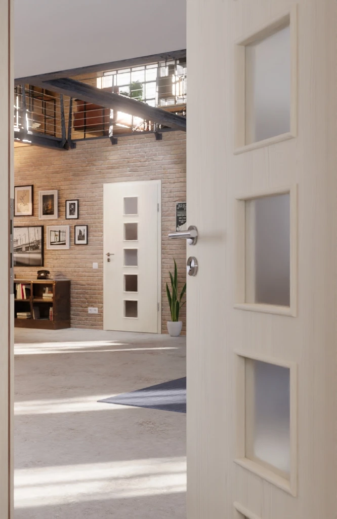 Das Türblatt beinhaltet fünf quadratische Lichtausschnitte, die gemeinsam ein spannendes Design ergeben. Zusätzlich gelangt auf diese Art und Weise Helligkeit in Ihren Raum.