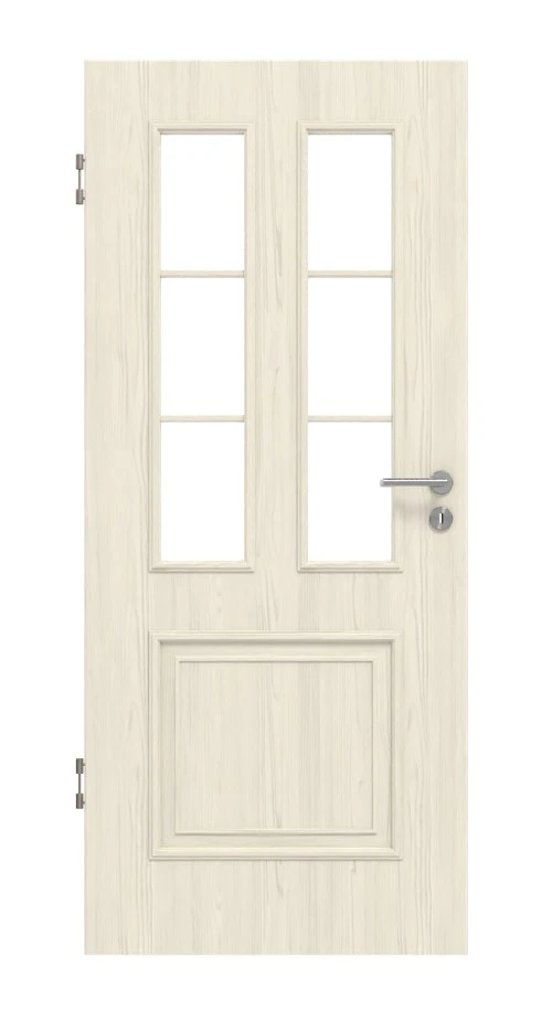 Die feinen Linien auf dem hellgelbem Piniendekor werden durch die eingeprägte Struktur hervorgehoben. Neben den stilvollen Profilleisten sind Sprossen auf dem Türblatt zu finden, die dem Modell ein individuelles Aussehen verleihen. Die Glasausschnitte im oberen Bereich sorgen für ein offenes Wohnraumdesign.
