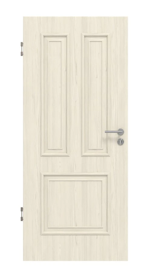 Die Profilleisten verleihen der Tür einen klassischen Look. Auf dem hellen Piniendekor befinden sich feine Maserungen, die haptisch hervorgehoben werden.