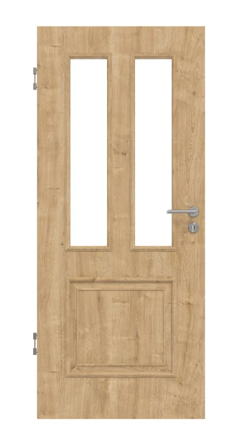 Das gelb-braune Eichendekor wirkt durch die eingeprägte Struktur authentisch. Die beiden im oberen Türbereich eingelassenen Glasausschnitte sorgen für Helligkeit und Freundlichkeit in Ihren Räumen. Einen klassischen Look erhält das Türblatt dank der Profilleisten.