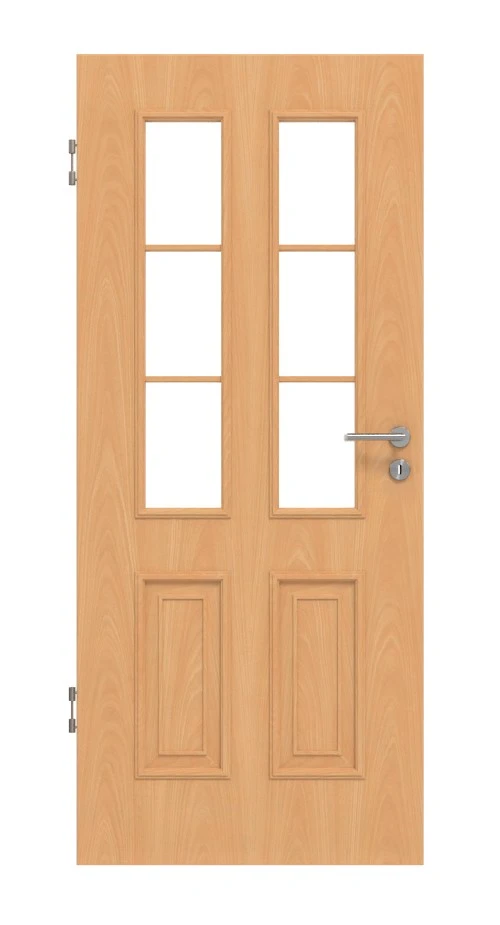 Für ein offenes Wohnraumdesign sorgen die beiden Lichtausschnitte im oberen Türbereich. Auf der Holzoberfläche sind Profilleisten und Sprossen angebracht, die der Tür einen klassischen und individuellen Look verleihen. Die rotbraune Farbe des Buchendekors sorgt für ein warmes und gemütliches Flair in Ihren Räumen.