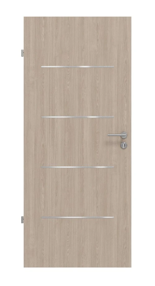 - Design-Besonderheiten: Türblatt mit aufgelegten Applikationen in Edelstahl‑Optik, Breite 10 mm