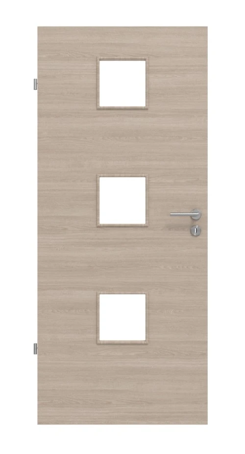 Im Türblatt befinden sich drei kleinere, quadratische Lichtausschnitte, die in Kombination eine interessante Optik ergeben. Dadurch gelangt gleichzeitig auch etwas Helligkeit in Ihren Raum.