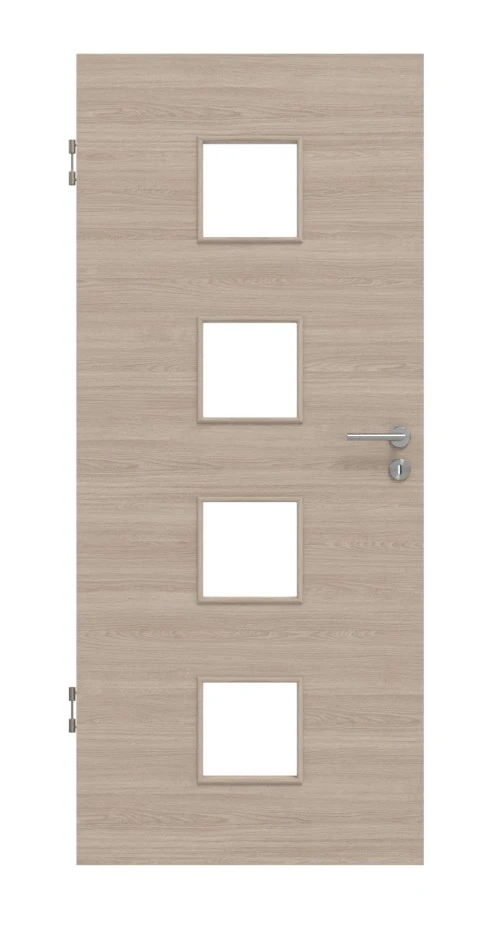 Vier quadratische Glasausschnitte sind in der Mitte des Türblatts eingelassen. Sie fungieren als optisches Highlight Ihrer Tür, lockern den Gesamteindruck gekonnt auf und lassen viel Helligkeit in Ihren Raum.