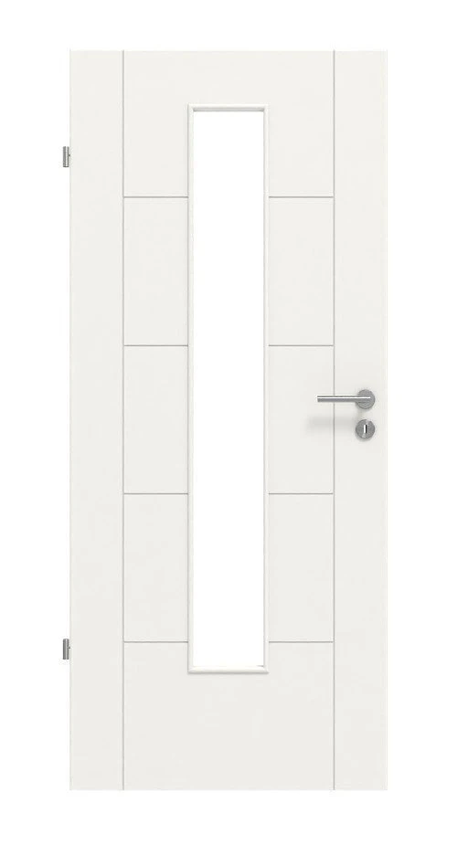 Die eingefrästen Fugen lassen ein geometrisches Muster auf dem Türblatt entstehen. In das weiß lackierte Türblatt ist ein Glasausschnitt eingelassen, der für Helligkeit in Ihrem Zuhause sorgt.