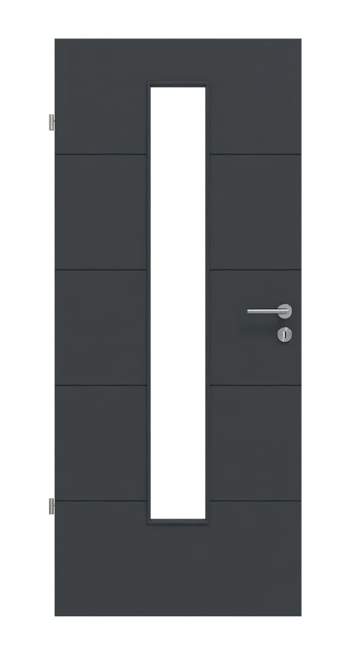 Der Mix aus waagerechten Einfräsungen und hochwertiger Lackierung in Anthrazit sorgt für eine edle Optik. Durch die Glasfläche in der Mitte des Türblatts gelangt Licht in Ihre Räume.