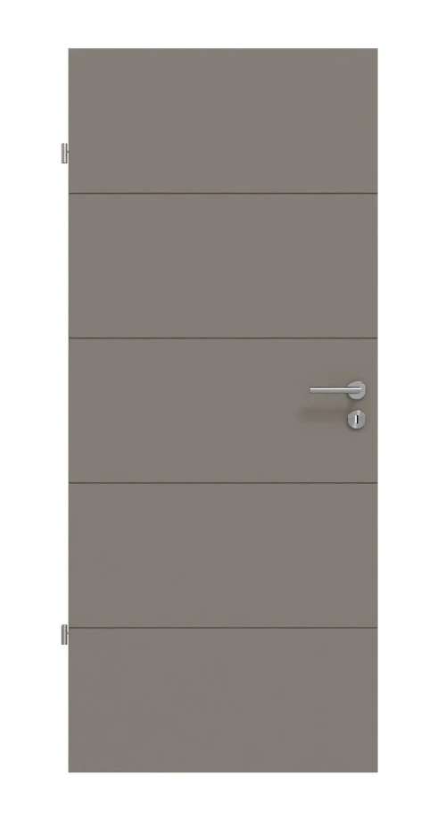 In das Türblatt sind vier waagerechte Fugen eingefräst. Diese verlaufen bis zum Rand des Türblatts. Dank der grau-braunen Lackoberfläche passt sich das Modell jedem Wohnraumdesign an.