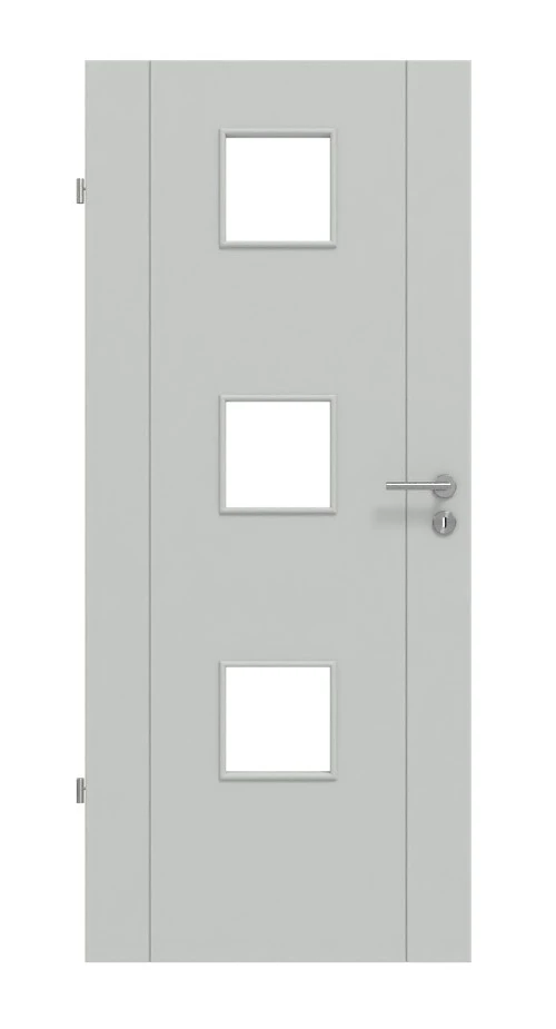 Zwei senkrechte Fugen zeichnen sich auf dem grau lackierten Türblatt ab. Durch die drei kleinen Glasausschnitte dringt Helligkeit in Ihre Räume, womit ein freundliches Wohnraumflair entsteht.