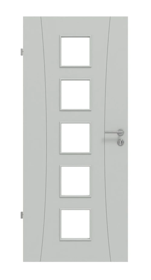 Auf dem graulackierten Türblatt sind zwei geschwungene Fugen zu sehen. In der Mitte des Türblatts befinden sich fünf quadratische Lichtausschnitte.