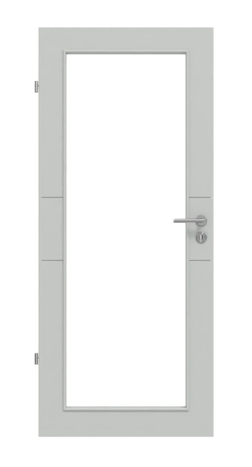 Auf dem graulackierten Türblatt sind zwei waagerechte Fugen zu sehen. Dank des großen Glasausschnitts gelangt viel Licht in Ihr Zuhause.