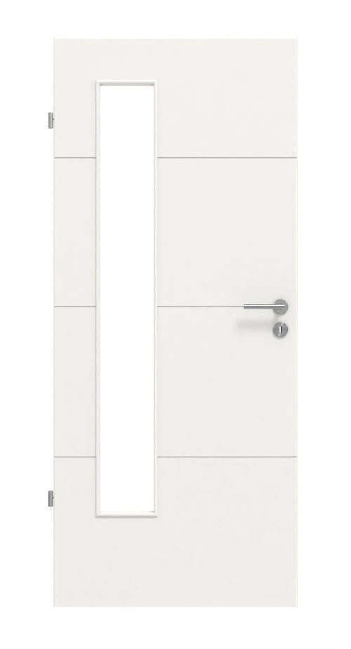 Drei waagerechte Fugen verlaufen über das weißlackierte Türblatt und verleihen dem Modell eine individuelle Optik. Auf der Bandseite ist ein schmaler Glasausschnitt eingelassen. Dieser sorgt für ein offenes Wohnraumflair.