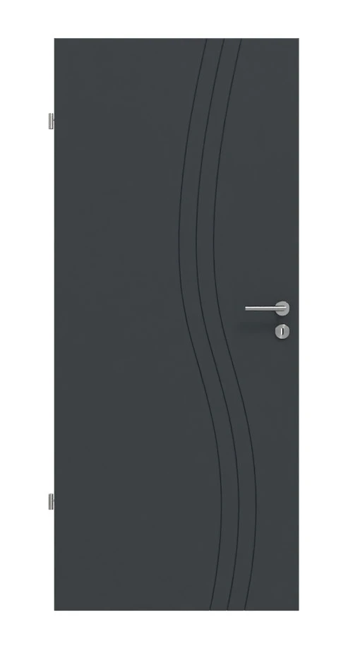Drei geschwungene Fugen zeichnen sich auf dem Türblatt ab. Auf der Oberfläche ist eine Lackierung in Anthrazit aufgetragen.