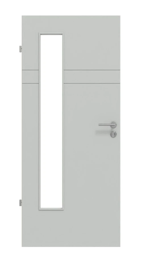 Auf dem graulackierten Türblatt sind zwei ästhetische Fugen zu sehen. Durch den schmalen Glasausschnitt auf der Bandseite gelangt viel Licht in Ihre Räume.