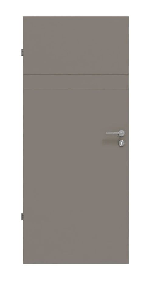 Die exklusive Lackierung in Grau-braun garantiert einen brillanten Glanz auf dem Türblatt. Dank der beiden eingefrästen Fugen auf Augenhöhe entsteht ein individuelles Türdesign.