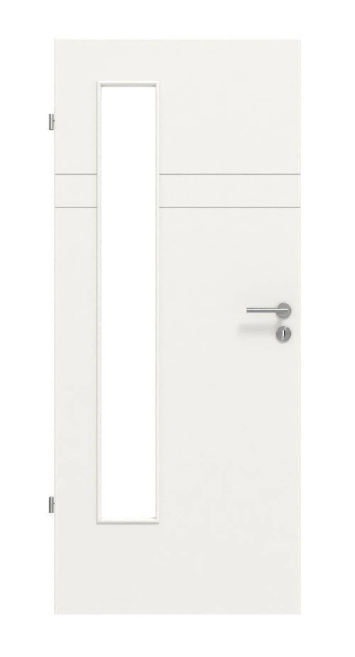 Das weißlackierte Türblatt zeichnet sich durch zwei waagerechte Fugen aus, die auf Augenhöhe eingefräst sind. Für lichtdurchflutete Räume sorgt der schmale Glasausschnitt auf Bandseite.