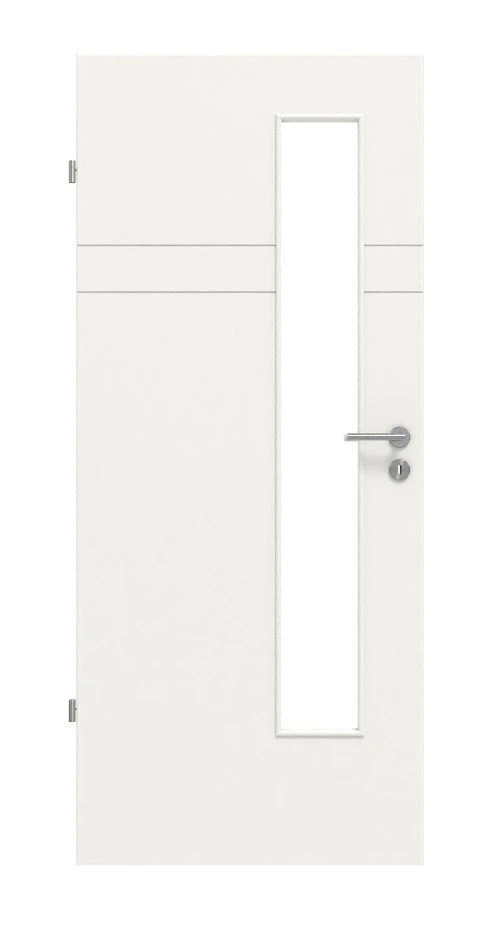 Im oberen Türbereich sind zwei waagerechte Fugen in das Türblatt eingefräst. Die weiße Lackoberfläche garantiert ein freundliches und modernes Design. Auf der Schlossseite ist ein schmaler Glasausschnitt eingelassen, der für lichtdurchflutete Räume sorgt.
