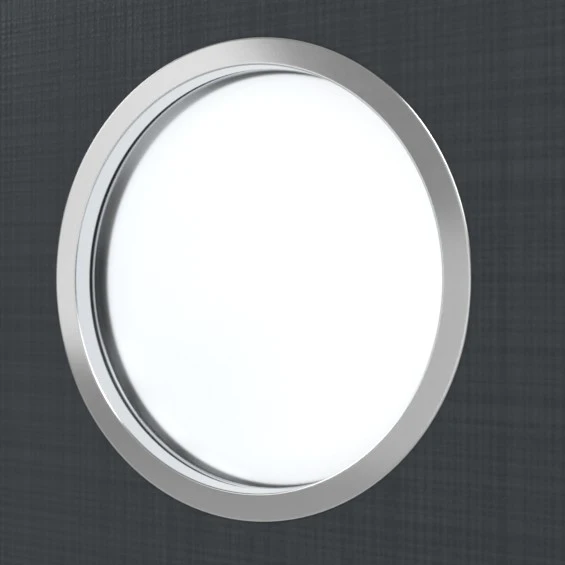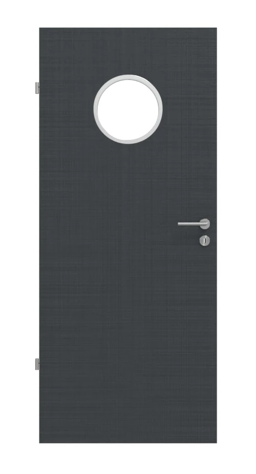Die eingeprägte Struktur hebt die feinen Linien des dunklen Leinendekors haptisch hervor. Durch den runden Glasausschnitt, der dem Modell einen nautischen Charakter verleiht, dringt Licht und damit Freundlichkeit in Ihr Zuhause.