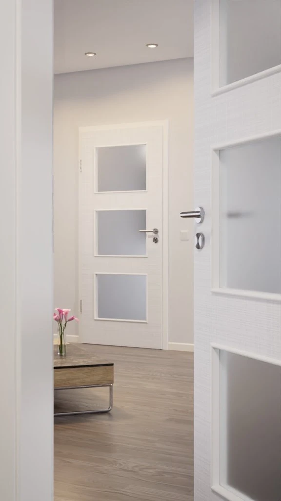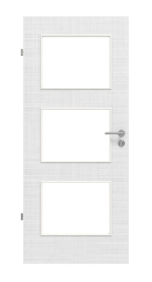 Durch die drei großen Glasausschnitte dringt viel Licht in Ihr Zuhause. Der Mix aus transparentem Material und weißen Leinendekor sorgt für ein modernes Design, das sich Ihrer Wohnraumgestaltung anpasst.