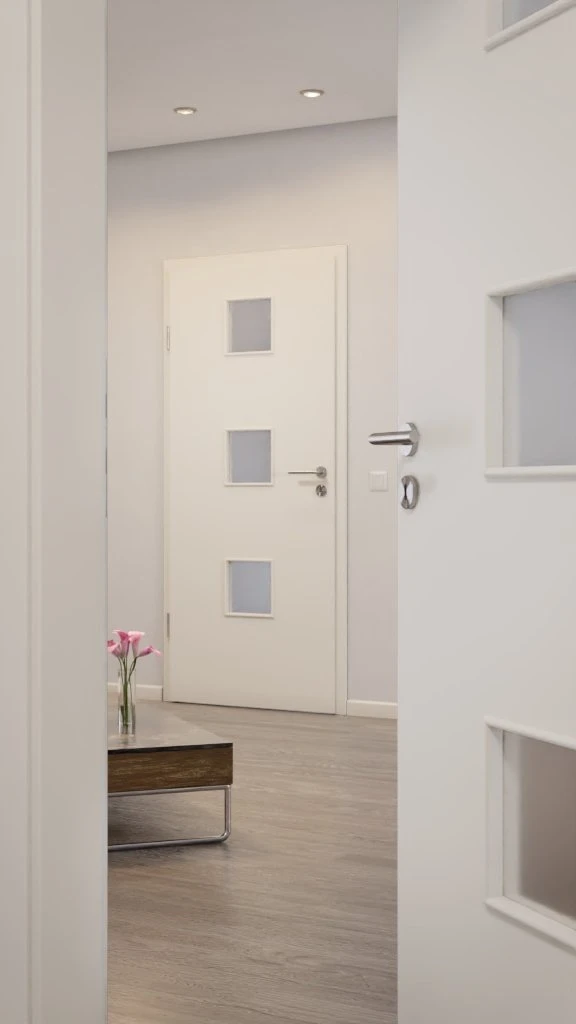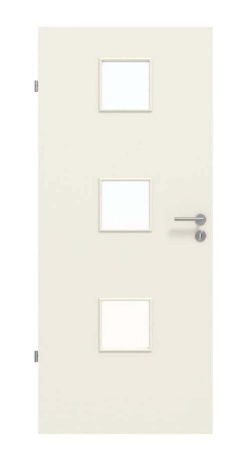 Im Türblatt befinden sich drei kleinere, quadratische Lichtausschnitte, die in Kombination eine interessante Optik ergeben. Dadurch gelangt gleichzeitig auch etwas Helligkeit in Ihren Raum.