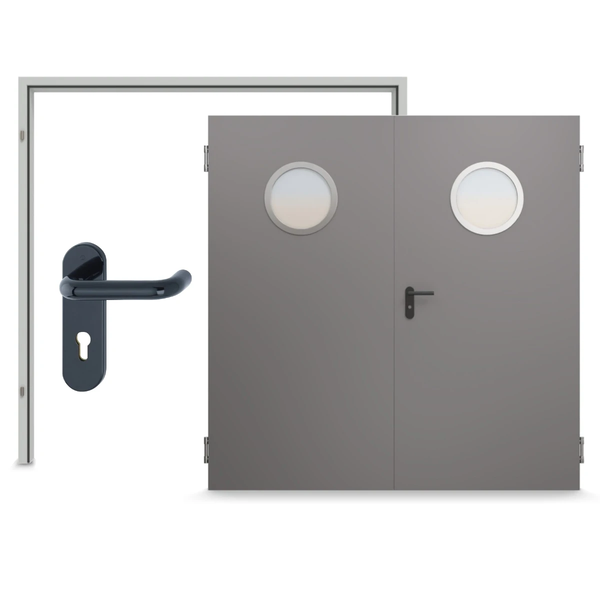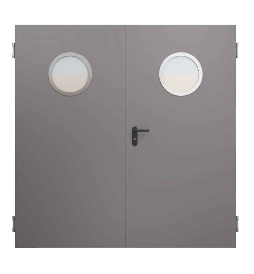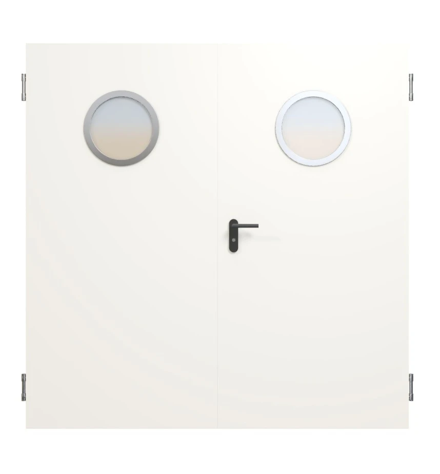 Die eingelassenen Rundverglasungen im oberen Bereich des jeweiligen Türblatts lassen die Tür modern erscheinen.