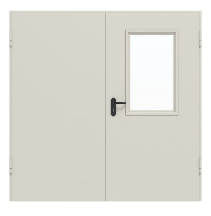 Ein wahrer Allrounder: Das Komplettset inklusive der zweiflügeligen Stahl-Mehrzwecktür D65-2 OD LA-B2, Blockzarge und Türdrücker des Qualitätsherstellers Hörmann hält einiges aus und verfügt über einen Lichtausschnitt im oberen Bereich des Gehflügels.
