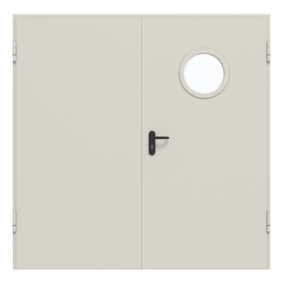Vielseitig einsetzbar: Das Komplettset inklusive der zweiflügeligen Stahl-Mehrzwecktür D65-2 OD LA-Bullauge, Blockzarge und Türdrücker verbindet Flexibilität und Qualität.