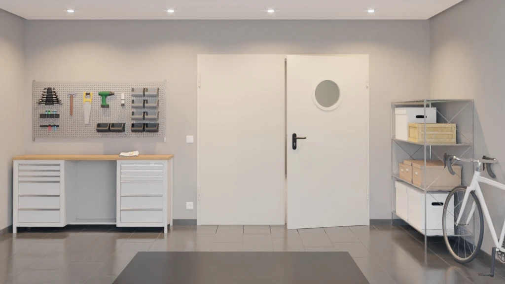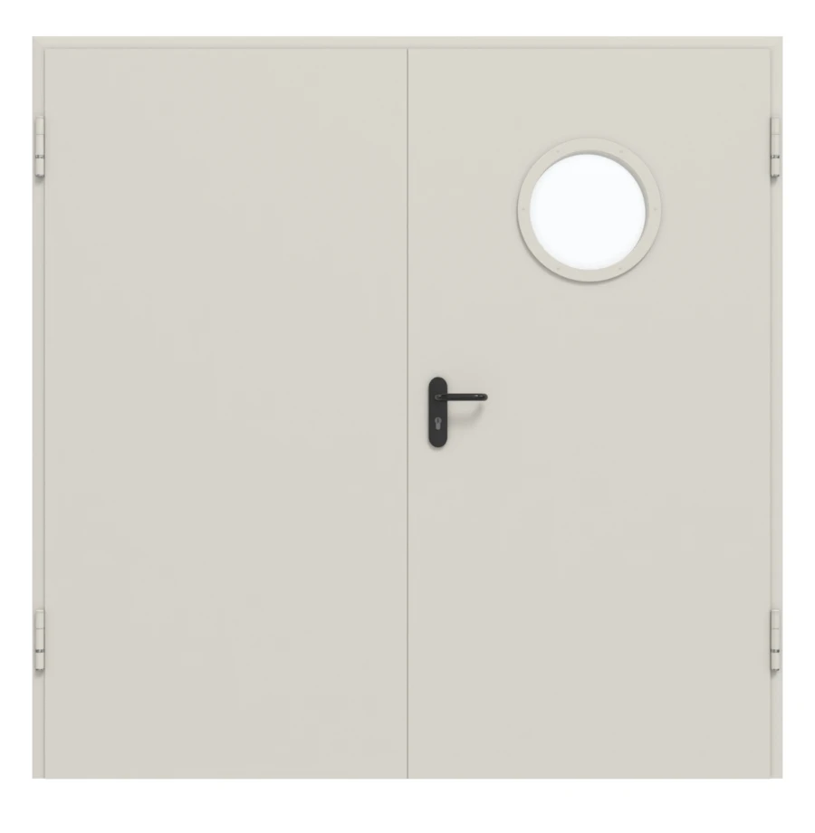 Funktional und vielseitig: Dieses Komplettset inklusive der zweiflügeligen Stahl-Mehrzwecktür D65-2 OD LA-Bullauge, DryFix-Zarge und Drücker des Qualitätsherstellers Hörmann ist ein alltagsbeständiger Begleiter.