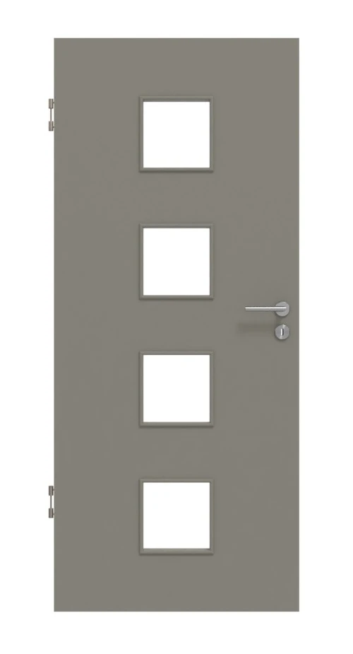 Vier quadratische Glasausschnitte sind in der Mitte des Türblatts eingelassen. Sie fungieren als optisches Highlight Ihrer Tür, lockern den Gesamteindruck gekonnt auf und lassen viel Helligkeit in Ihren Raum.