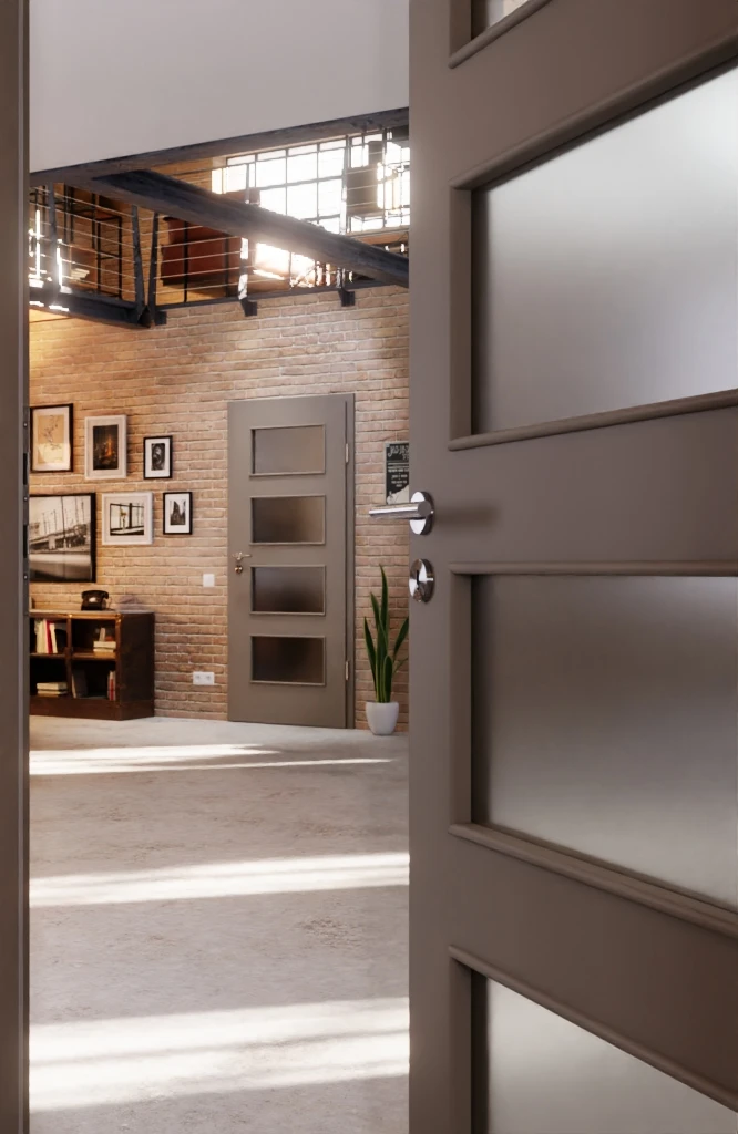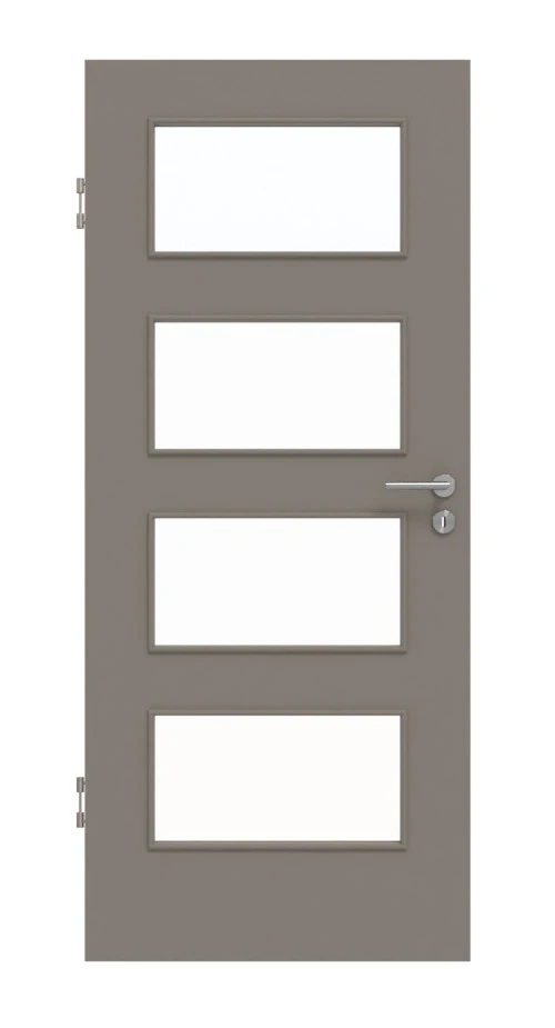 In das Türblatt sind vier rechteckige Lichtausschnitte eingelassen. Dank der Lackierung in Grau-braun entsteht ein brillanter Glanz.