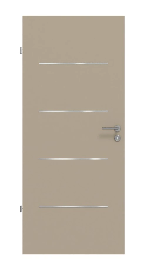 Vier Lisenen sind in das grau-braune Türblatt eingelassen. Die seidenmatte Oberflächenstruktur unterstreicht den eleganten Look.