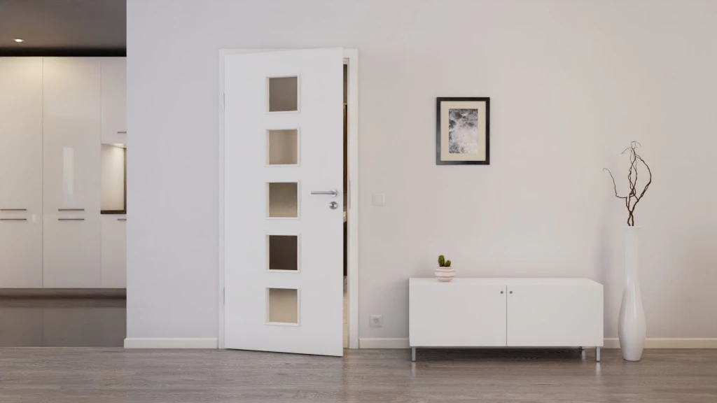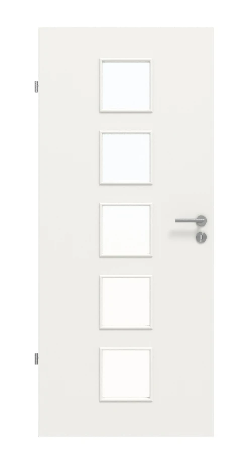 Das Türblatt beinhaltet fünf quadratische Lichtausschnitte, die gemeinsam ein spannendes Design ergeben. Zusätzlich gelangt auf diese Art und Weise Helligkeit in Ihren Raum.