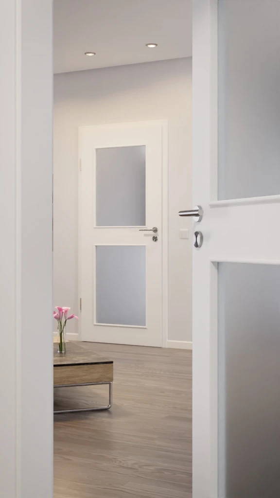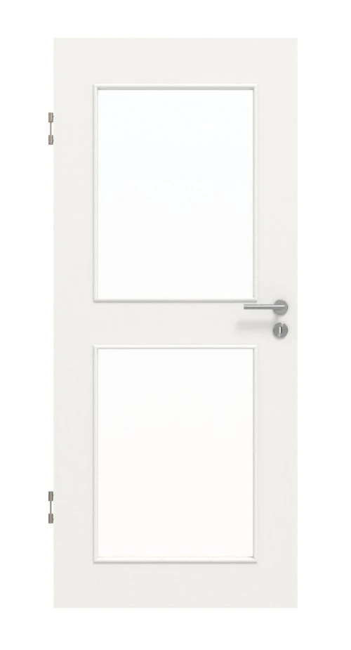 Die Weißlackierung punktet durch eine seidenmatte Struktur. Viel Licht gelangt durch die beiden großen Glasausschnitte, die in das Türblatt eingelassen sind.