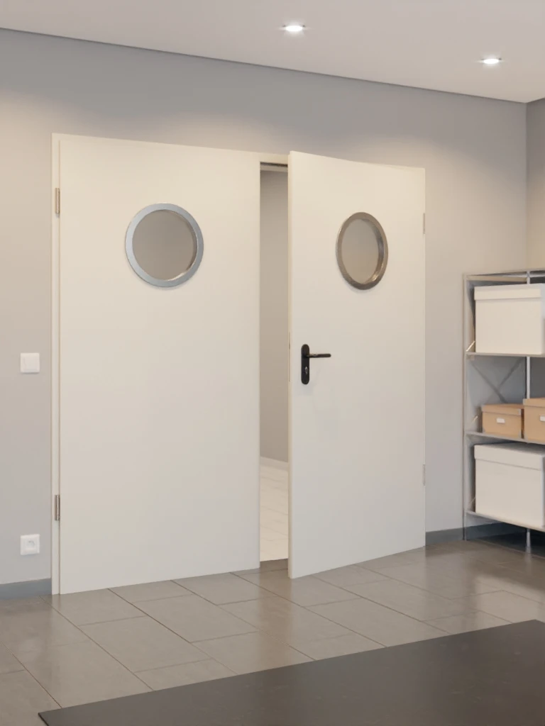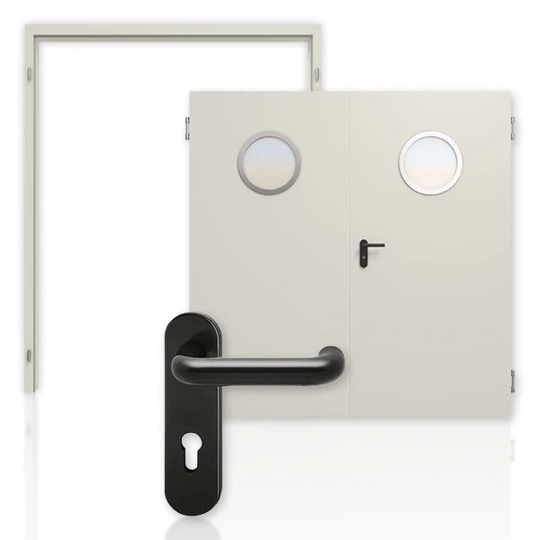 - Oberflächenart und -farbe: Türblatt und Zarge, verzinkt und pulvergrundbeschichtet (RAL 9002)